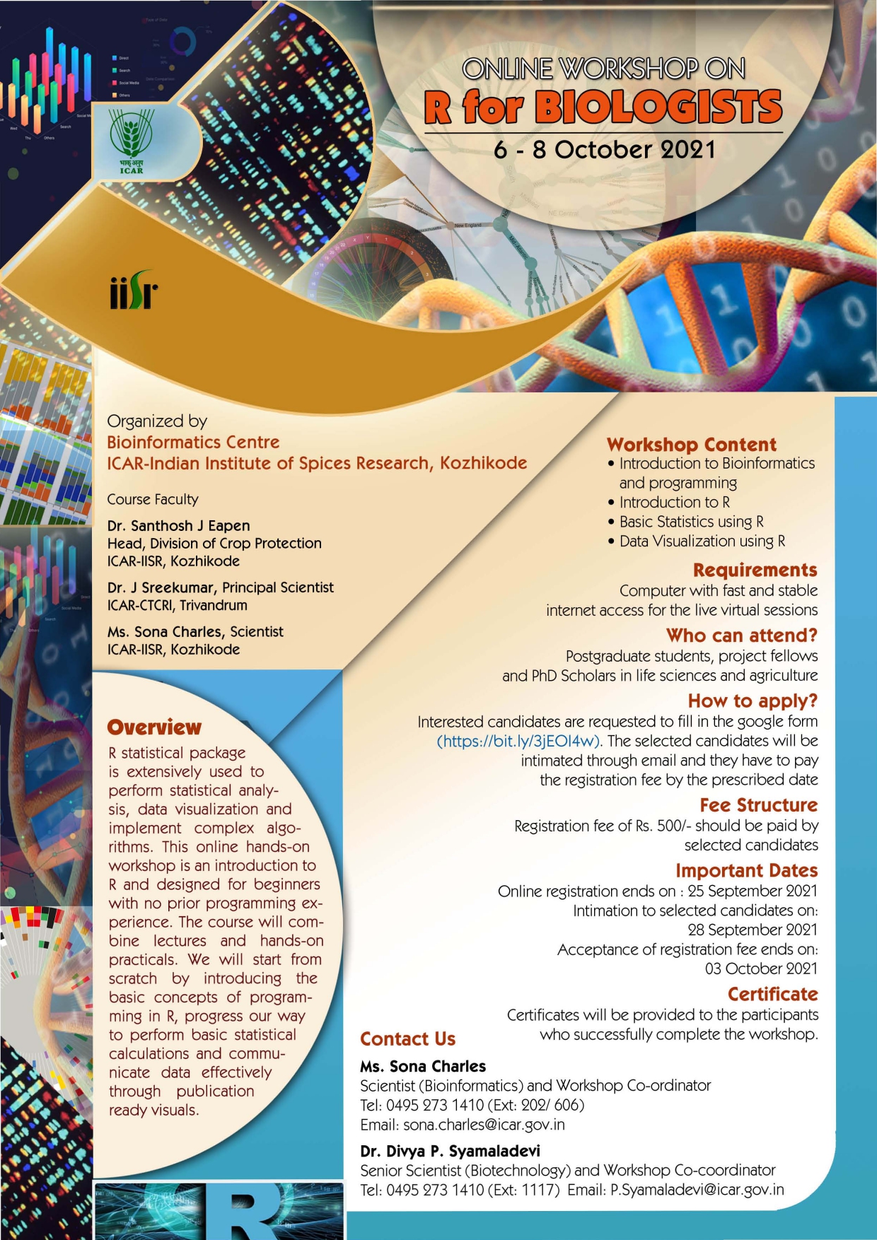 A three days hands-on workshop was organised by the Bioinformatics Centre, ICAR- Indian Institute of Spices Research, Kozhikode from 6-8 October, 2021 for PG students, Research Scholars and Project Fellows / JRFs. The sessions we handled by Ms. Sona Charles, Dr. Divya P Syamaladevi, Dr. Santhosh J Eapen from ICAR-IISR and Dr. Sreekumar J from ICAR-CTCRI, Thiruvananthapuram. The workshop included theory as well as hands-on sessions on basic Bioinformatics, introduction to R, statistics using R and data visualization using R packages. 48 participants were selected from over 150 applicants for the workshop from various ICAR/ SAUs and colleges. The questions from the participants were answered during the discussion.