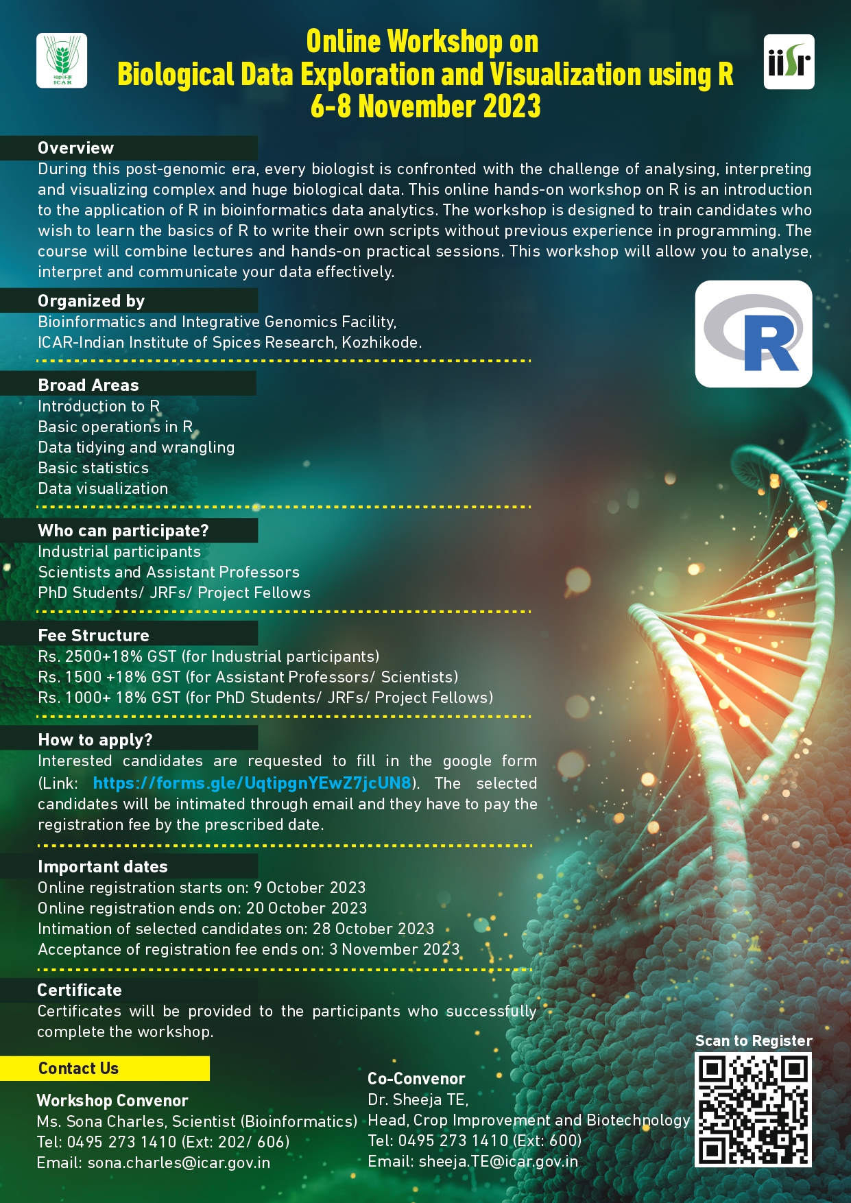A three-day online hands-on workshop titled “Biological Data Exploration and Visualization using R” was organized by the Bioinformatics and Integrative Genomics Facility, ICAR–Indian Institute of Spices Research, Kozhikode from 6–8 November 2023. The workshop was inaugurated with a welcome address and introductory remarks by Dr. T. E. Sheeja, Head, Crop Improvement and Biotechnology Division, ICAR–IISR. The course overview was presented by Dr. Sona Charles, Scientist (Bioinformatics), ICAR–IISR.