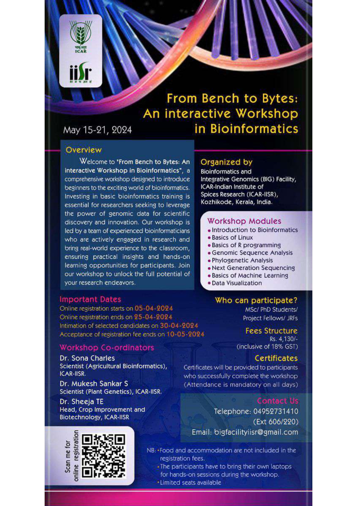 The Bioinformatics and Integrative Genomics (BIG) Facility at ICAR–IISR offers advanced workshops at the forefront of bioinformatics and its applications. These workshops are designed to train students, researchers, and academicians in modern computational biology techniques, focusing on the analysis and interpretation of diverse biological data. Training includes working with high-throughput sequencing datasets, protein–protein interaction networks, pathway analysis, metabolomics, and epigenomics, along with the visual, statistical, and command-line tools required for comprehensive bioinformatics analysis.