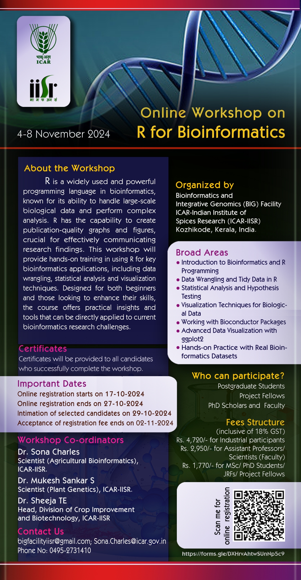 An intensive five-day online workshop titled “R for Bioinformatics” was conducted by the Bioinformatics and Integrative Genomics Facility, ICAR–Indian Institute of Spices Research, from 4–8 November 2024. The program brought together 60 participants from various prestigious institutions across India, including scientists, research scholars, and postgraduate students.